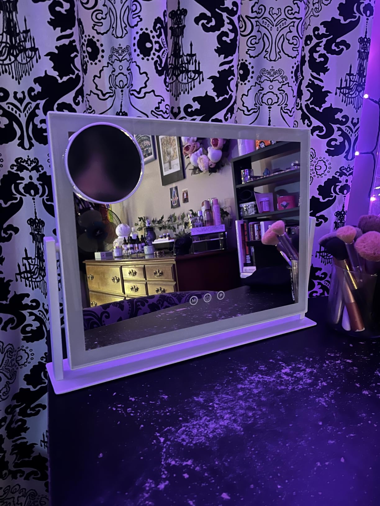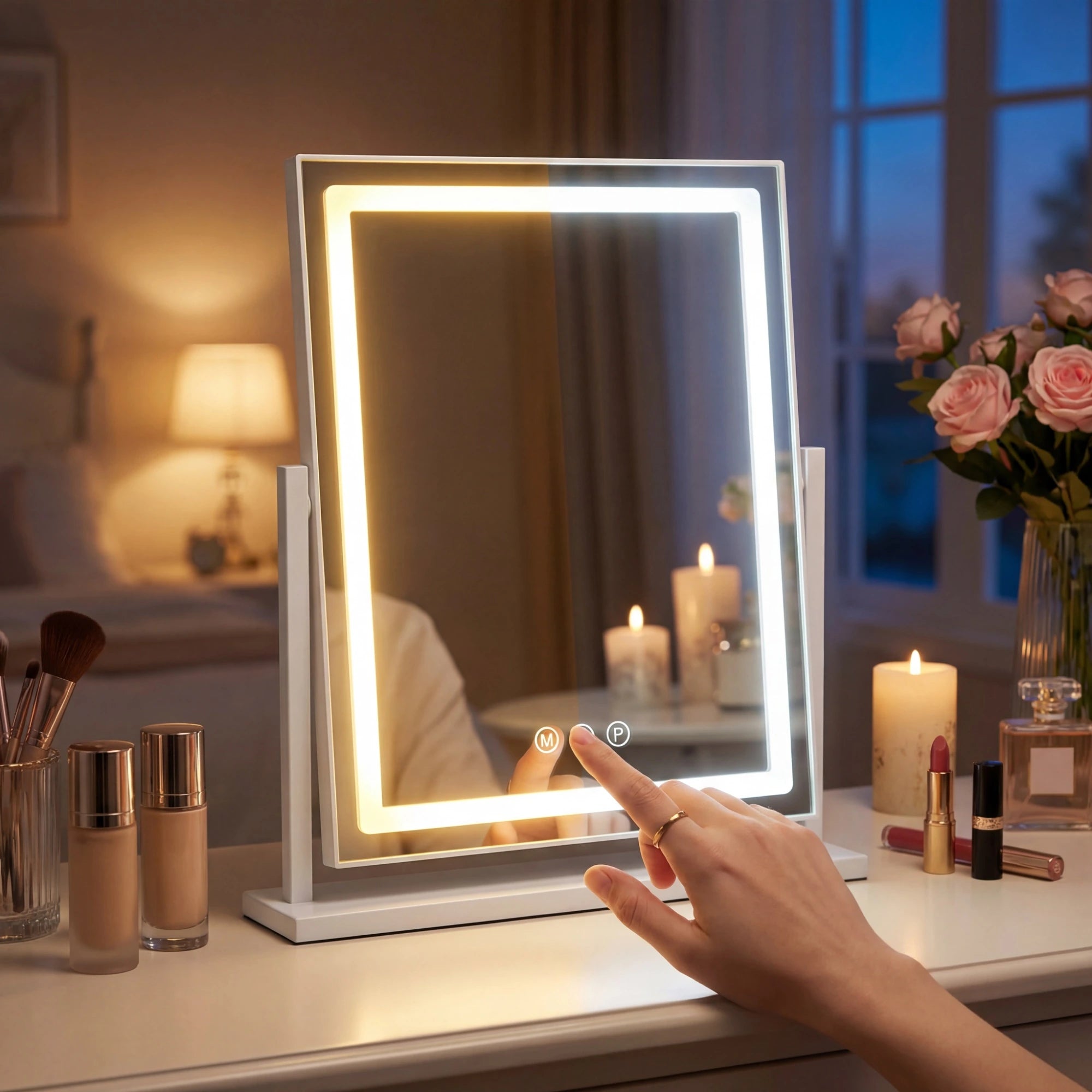 The capacitive touch sensor responds instantly to single taps, no repeated pressing required. Cheap mirrors use resistive sensors that often fail to register touches or require firm pressure. The controls are positioned on the mirror frame for easy access: power button turns on/off, "M" cycles through color modes, long-press "P" adjusts brightness. Memory function saves your last setting so you don't reset every time.
