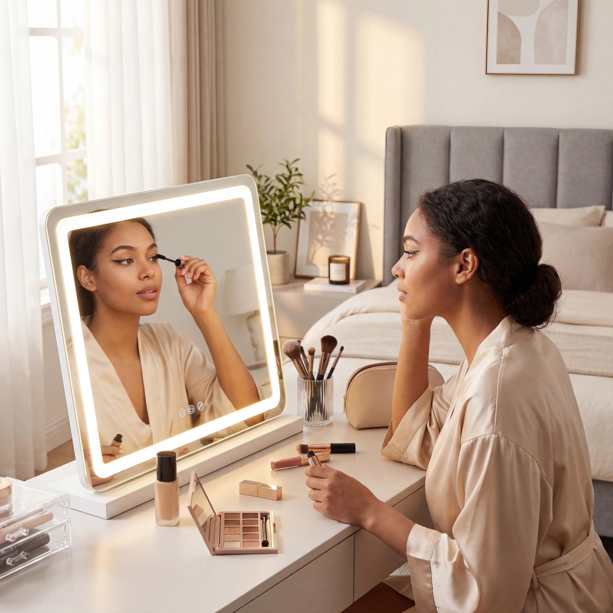 Warm (3000K) mimics incandescent home lighting and sunset. Natural (4500K) matches mid-day sunlight this is most accurate for seeing true makeup colors. Cool (6500K) replicates fluorescent office lighting and overcast daylight. Having all three lets you check how your makeup will look in different environments before you leave home, preventing the "looked perfect in bathroom, looks orange at work" problem.